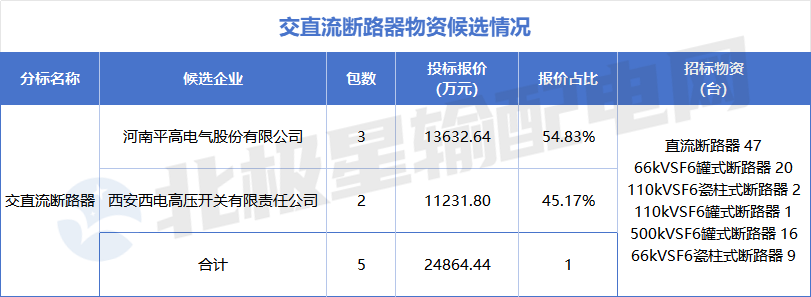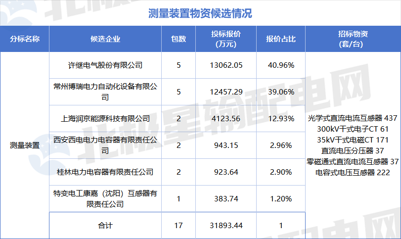 其次为许继电气股份有限公司,投标报价约151837.71万元,入围7个标包,入围物资包括2套 IGBT换流阀、229套光学式直流电流互感器、15台直流电压分压器、9套零磁通式直流电流互感器、5台35kV干式电磁CT、2套直流控制保护。