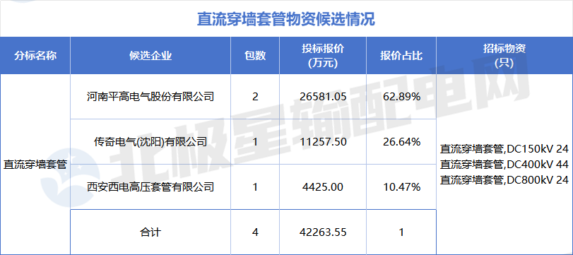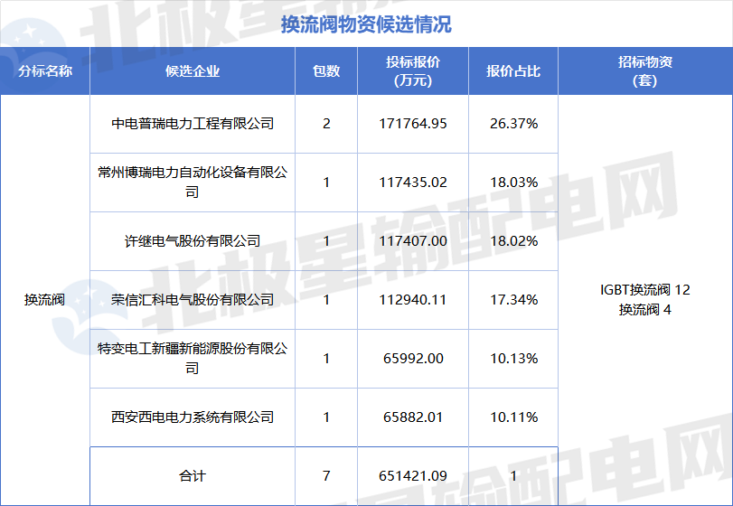 本次招标共有66家企业入围中标候选人,其中中电普瑞电力工程有限公司投标报价最高,共计约171764.95万元,入围2个标包,入围物资包括4套换流阀、2套IGBT换流阀。
