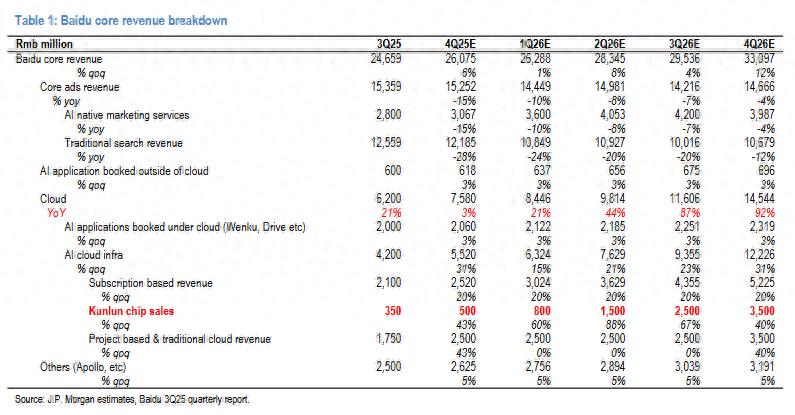 摩根大通大幅上调百度目标价:市场严重低估AI转型速度,昆仑芯片明年销量或飙6倍,驱动云业务增长61%