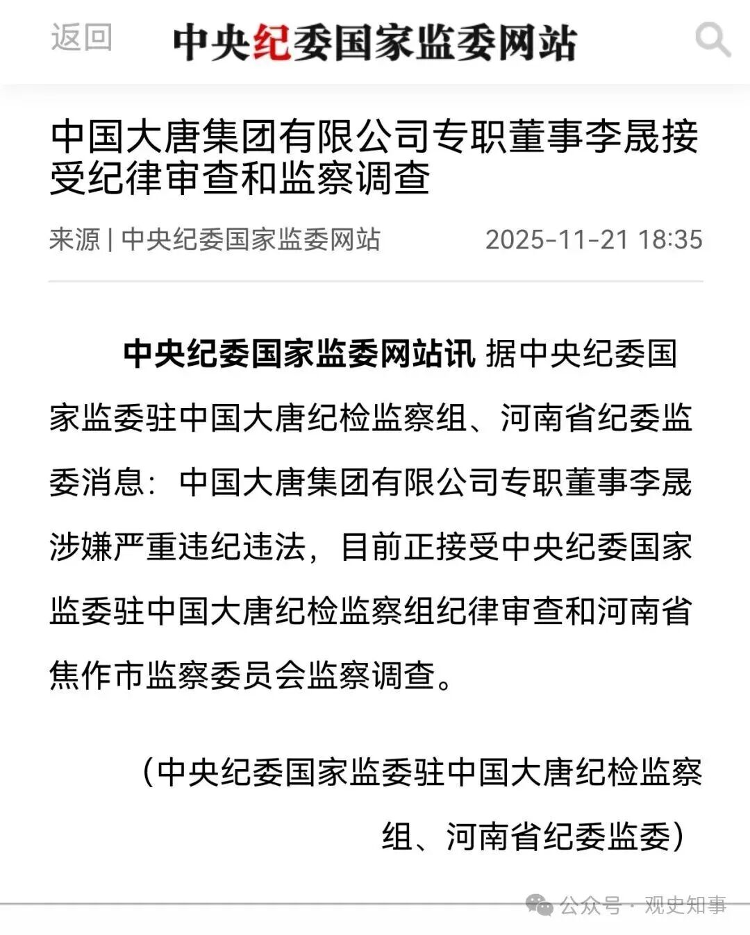 中国大唐集团 李晟被查!曾任集团绿色低碳公司党委书记、董事长
