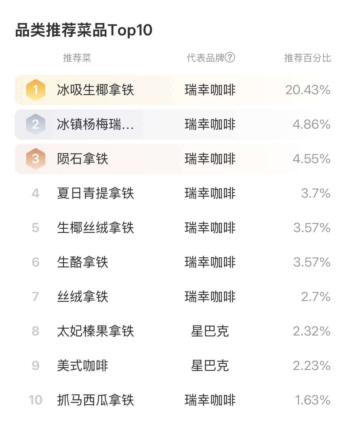 而要有销量,只靠“鲜奶”概念不够,还得打造爆品,但产品创新难度之高不言自明。事实上,窄门餐眼显示,咖啡品类推荐产品TOP10中,瑞幸多达8款, 星巴克 2款,其它品牌没能上榜。