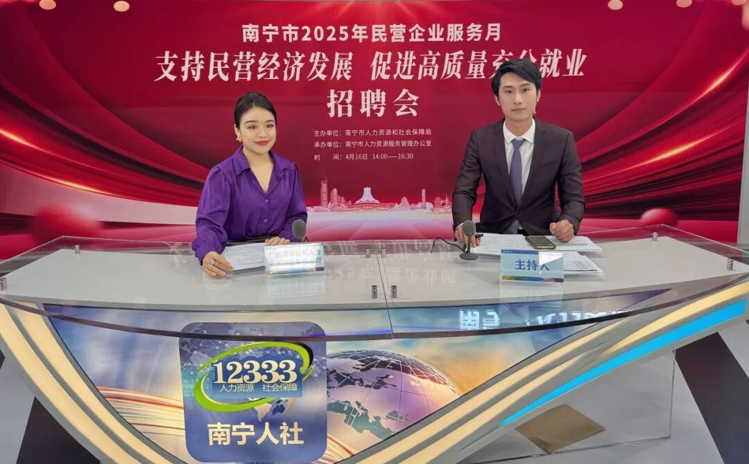 ▲4月16日,广西锦绣前程人力资源股份有限公司人资人员(左)参加南宁市2025年民营企业服务月专场招聘会直播带岗活动,直播介绍招聘岗位信息