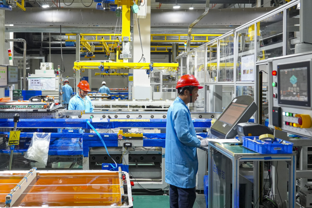 ▲在比亚迪股份有限公司投资的电池项目中,PACK生产车间的工人正紧张有序地忙碌着(南宁日报记者黄维业摄)