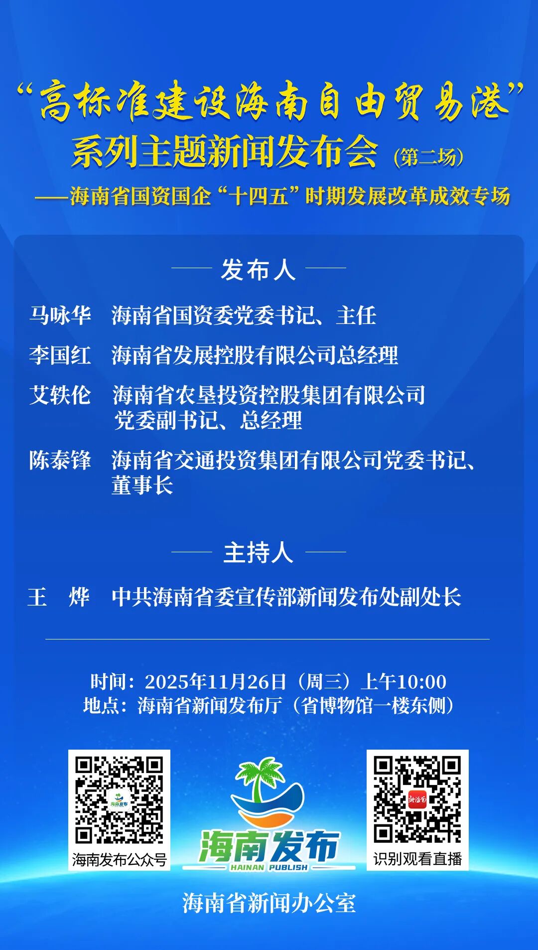 海南省新闻办公室将于2025年11月26日(星期三)上午10:00在海南省新闻发布厅(省博物馆一楼东侧)举行“高标准建设海南自由贸易港”系列主题新闻发布会(第二场)——海南省国资国企“十四五”时期发展改革成效专场,邀请海南省国资委党委书记、主任马咏华,海南省发展控股有限公司总经理李国红,海南省农垦投资控股集团有限公司党委副书记、总经理艾轶伦,海南省交通投资集团有限公司党委书记、董事长陈泰锋介绍相关情况,并答记者问。