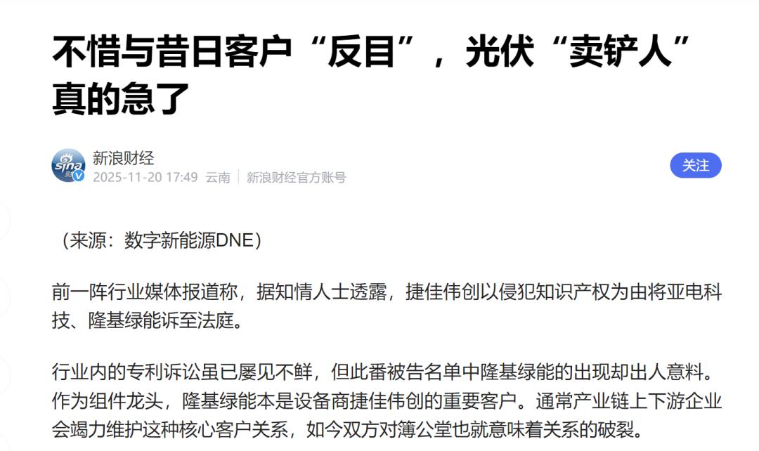 近期,行业内就爆出了一则极具象征意义的案件:光伏设备龙头 捷佳伟创 以侵犯知识产权为由起诉了其核心大客户 隆基绿能 。