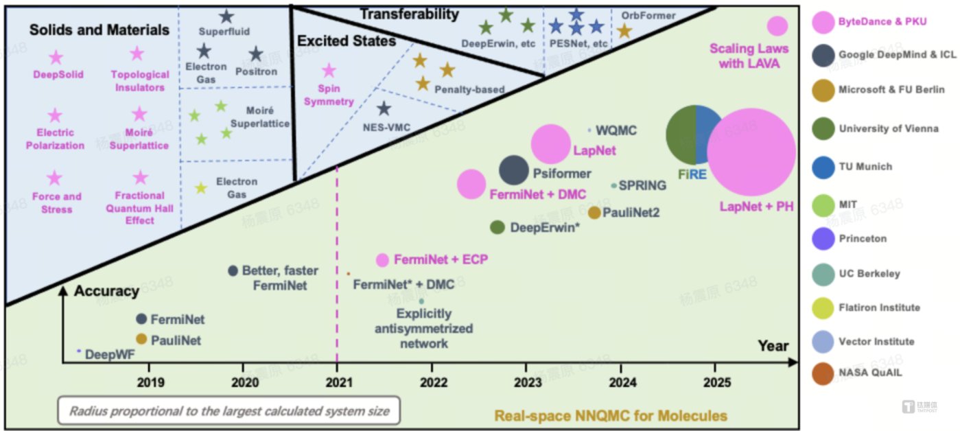 图中的横坐标指的是时间,这个领域早期代表性的工作是DeepMind的FermiNet等,2019 年我们几个人在会议室里就讨论过这项工作。这个领域叫做NNQMC(神经网络量子蒙特卡洛方法)。大概是什么意思呢? QMC 是量子蒙特卡洛,根据变分原理,任何试验波函数计算得到的系统能量总是大于或等于真实基态能量。于是,我们就可以用神经网络去表示一个波函数,然后,在这个波函数上进行采样并计算系统能量。然后,我们就可以按照能量更小方向的梯度去更新神经网络,最终得到一个更优的波函数表示。
