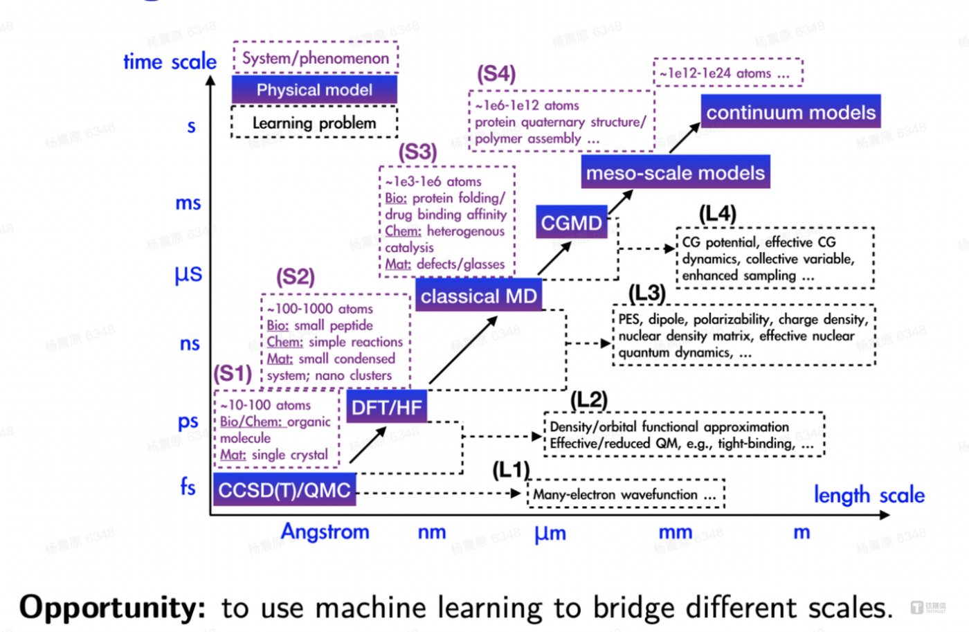 大家可以看,横坐标代表了空间尺度,纵坐标是时间尺度。这张图代表了物理和科学计算的一些问题。比如最左下角的是第一性原理计算,它包括CCSD、 QMC 等方法,它需要去计算多电子的波函数。再上走,分别是做了近似的DFT(密度泛函)。再往上走,不再去描绘波函数。而是使用粒子来做抽象,也就是分子动力学MD(Molecular dynamics),再往上抽象到粒子团簇;最上面抽象的流体力学、有限元等更高抽象的层次。