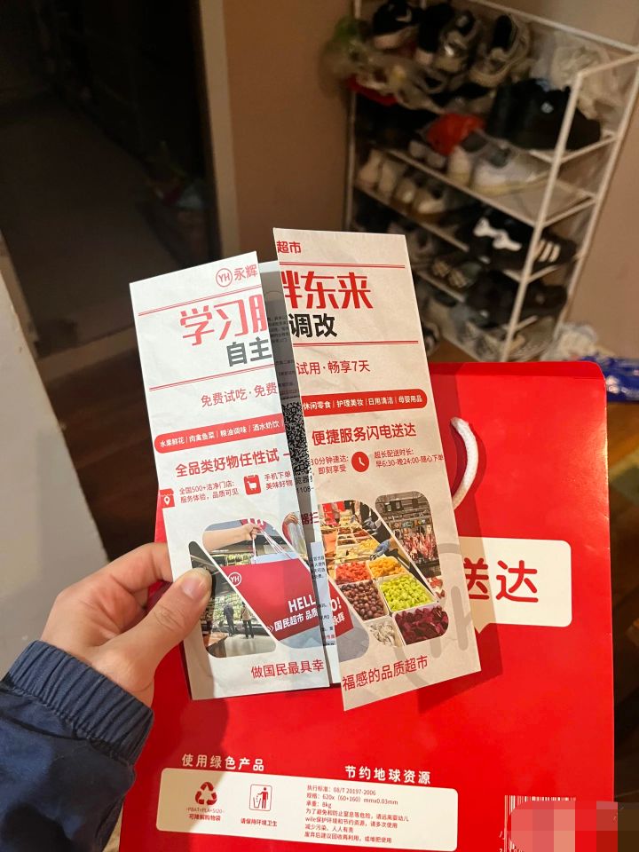 11月25日,大皖新闻记者注意到,网贴中上传了印有“ 永辉超市 ”图标的红色纸袋,以及写有“学 习胖 东来”自主调改的宣传单页。一张卡背面写有“持卡须知”“试用流程”,“试用流程”包括请使用手机淘宝、抖音或浏览器扫描页面二维码,然后点击“继续访问”,即可进入永辉在线客服页面”……