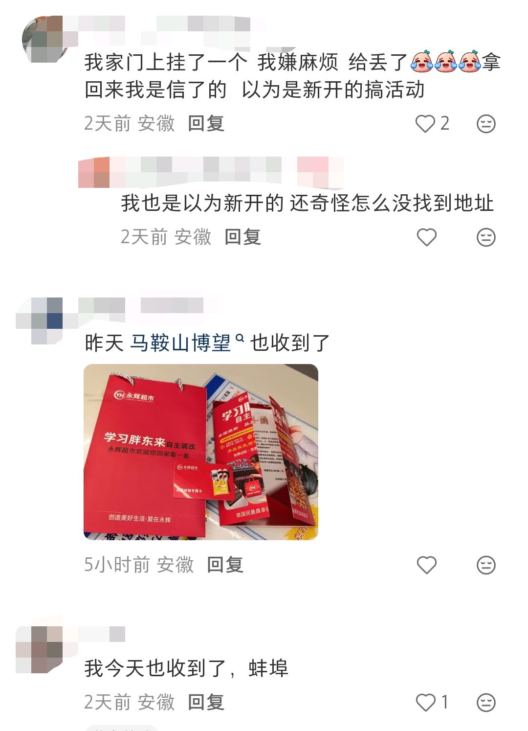 在这则网贴的下方,也有地址为安徽的网民留言表示“昨天马鞍山博望也收到了”“我今天也收到了,蚌埠。”