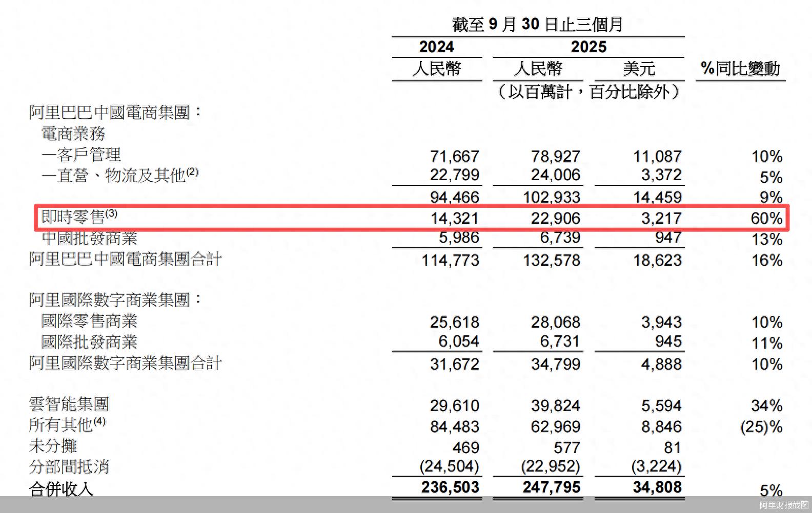 整体来看,阿里集团本季度收入为2477.95亿元,同比增长5%。剔除已出售业务影响,收入同比增长15%。