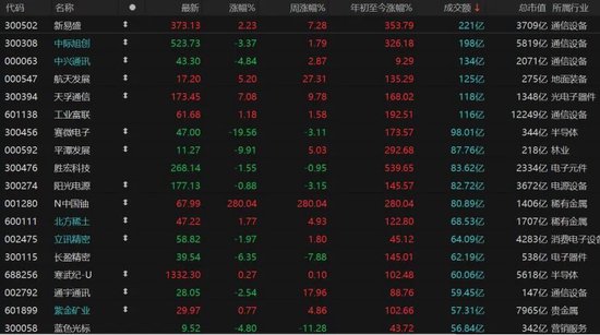 今日全市场共1443只个股收涨,涨停股54只;3876只个股收跌,跌停股14只。日成交额突破百亿元的个股共6只,新易盛收涨2.23%报373.13元/股,日成交额高达221亿元;中际旭创收跌3.37%报523.73元/股,中兴通讯收跌4.84%报43.3元/股。航天发展收涨5.2%报17.2元/股,天孚通信收涨7.08%报173.45元/股,工业富联收涨1.18%报61.68元/股。赛微电子收跌19.56%,平潭发展跌停。中国铀业今日在深交所挂牌上市,大涨280.04%报67.99元/股。