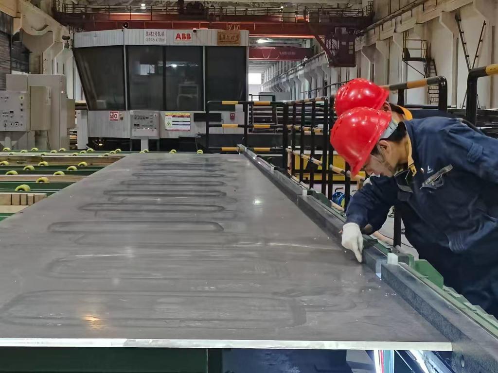 重庆西南铝机电设备工程有限公司 铝材精深加工基地的检测线上,技术人员在对LNG船板的直线度进行抽检。(受访者供图)
