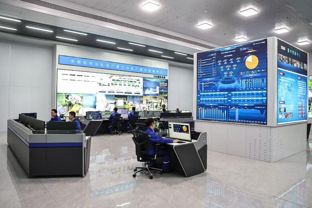 工作人员在 鞍钢集团 所属的 本钢板材 冷轧总厂第三冷轧厂集控中心监控设备运行情况。新华社记者潘昱龙摄