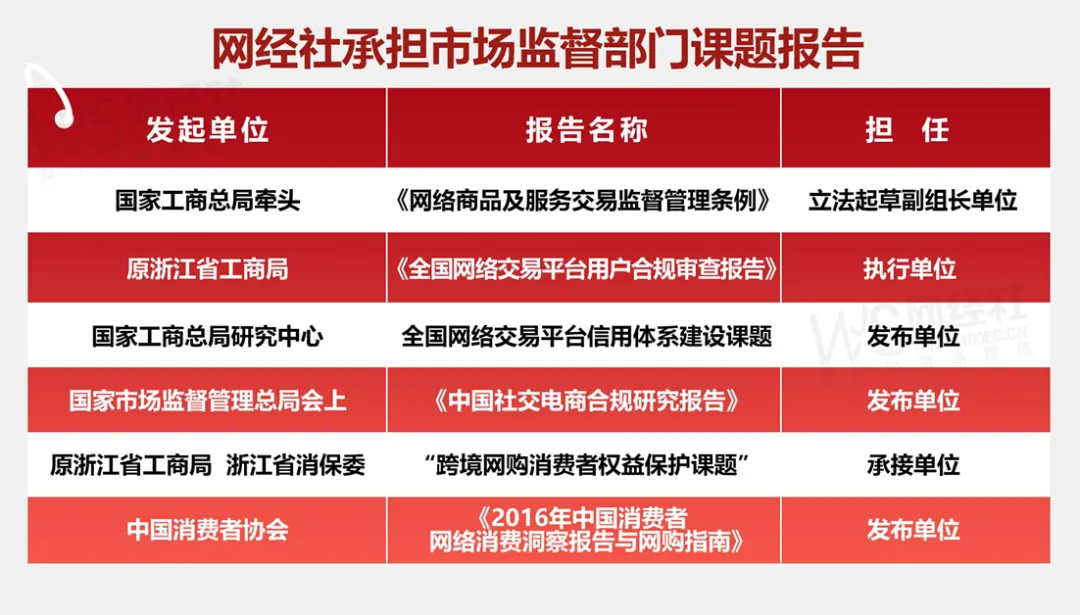 网经社在消费维权、立法等方面也取得不少成果,并得到有关部委、消协的肯定。如2020年网经社出席国家市监督总局在京召开的“互联网企业创建无传销网络平台座谈会”,发布国内首份 《中国社交电商合规研究报告》 ;2017年承接浙江省工商局、浙江省消保委委托的“跨境网购 消费者权益保护课题 ”;2016年承担承接国家工商总局和浙江省工商局“全国网络交易平台合规审查”调研课题项目;在国家工商行政管理总局消费者权益保护局、中国消费者协会指导,与《中国消费者报》举办的“促进电商发展指导网络消费”座谈会上,发布《 2016年 中国消费者网络消费洞察报告与网购指南 》。 2024年9月25日,浙江省消保委第四届专业委员会专家聘任仪式暨浙江《消法》实施办法修改座谈会在浙江省市场监督管理局举行。网经社电子商务研究中心主任 曹磊 受邀参加,并获聘浙江省消保委第四届电子商务专业委员会专家。