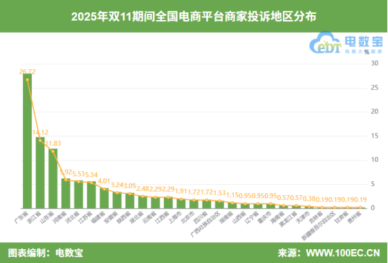 双11期间,“电诉宝”受理投诉商家注册地区TOP10依次为广东省(26.72%)、浙江省(14.12%)、山东省(11.83%)、河南省(5.92%)、河北省(5.53%)、江苏省(5.34%)、福建省(4.01%)、安徽省(3.24%)、陕西省(3.05%)、湖北省(2.48%)。