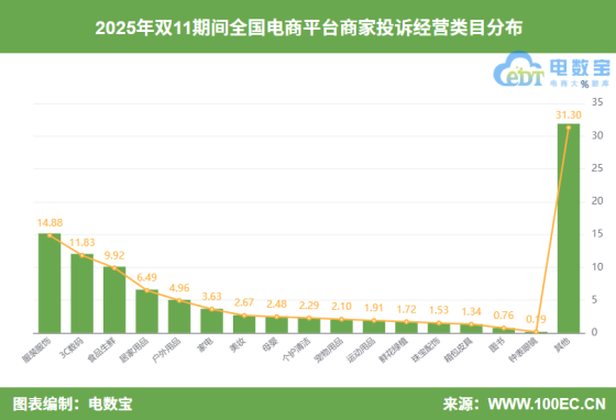 双11期间,“电诉宝”受理投诉商家的经营类目TOP10为服装服饰(14.88%)、3C数码(11.83%)、食品生鲜(9.92%)、居家用品(6.49%)、户外用品(4.96%)、家电(3.63%)、美妆(2.67%)、母婴(2.48%)、个护清洁(2.29%)、宠物用品(2.10%)。