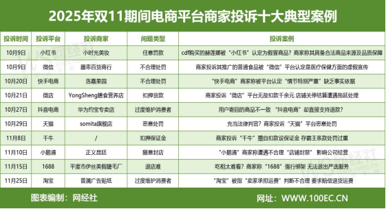 在此背景下,12月3日,依据国内知名网络消费纠纷调解平台“电诉宝”商家投诉通道(JTK.100EC.CN)双11期间(10月至11月)受理的全国电商平台大量商家投诉案例,网经社电子商务研究中心例行发布《2025年双11期间电商平台商家投诉数据报告》(报告下载:https://www.100ec.cn/zt/25s11sjtsbg/)。