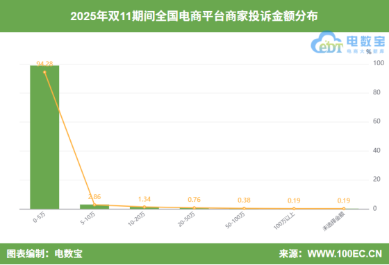 据“电诉宝”显示,双11期间商家投诉金额分布主要集中在0-5万(94.28%)、5-10万(2.86%)、10-20万(1.34%)、20-50万(0.76%)、50-100万(0.38%)、100万以上(0.19%)。