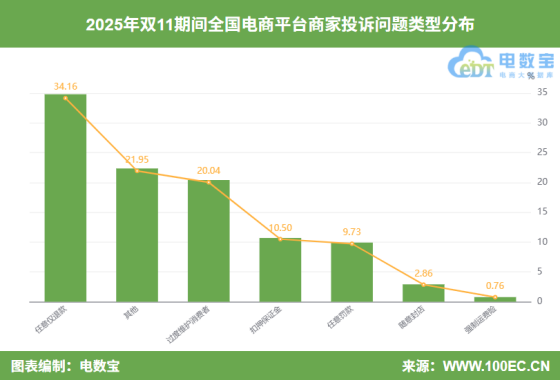 据“电诉宝”显示,双11期间全国电商平台商家投诉问题主要集中在这六项,其中任意仅退款占比高达34.16%,排在第一;其余问题类型依次为:过度维护消费者(20.04%)、扣押保证金(10.50%)、任意罚款(9.73%)、随意封店(2.86%)、强制运费险(0.76%)。