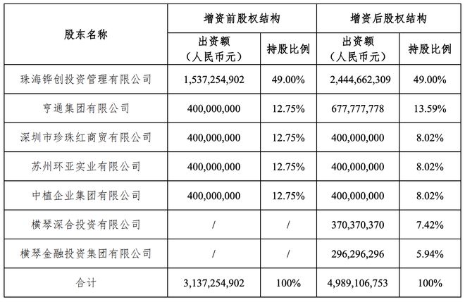 根据公告,此次增资由现有股东珠海铧创投资管理有限公司、亨通集团有限公司,以及新增股东横琴深合投资有限公司、横琴金融投资集团有限公司共同认缴。