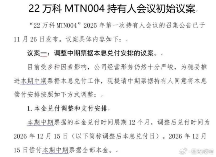 据了解,此前11月26日,“22 万科 MTN004”主承销商 浦发银行 发布公告,该行作为召集人拟召开债券持有人会议,对本期债券展期相关事项进行审议。该笔债券余额20亿元,利率3%,原本金兑付日为2025年12月15日。