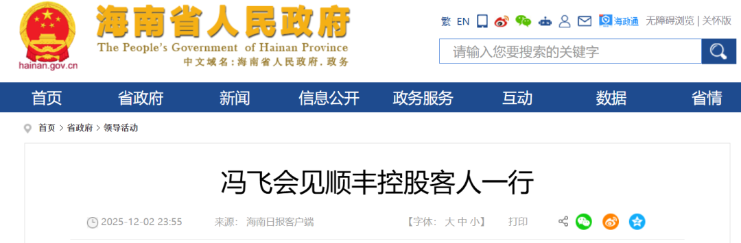12月2日,海南省委书记冯飞在海口会见顺丰控股股份有限公司董事长兼总经理王卫一行。