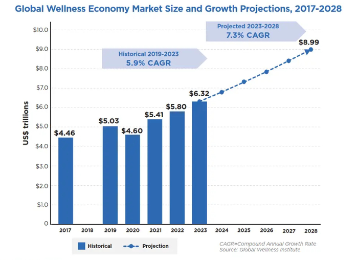 过去我们谈论营养品,要么聚焦婴幼儿,要么瞄准中老年保健品,但现在全家庭覆盖已成共识。今年在全球健康峰会(GWS)上发布的《2024年全球健康经济监测报告》显示,全球健康经济价值比疫情前增长了26%,达到6.3万亿美元。