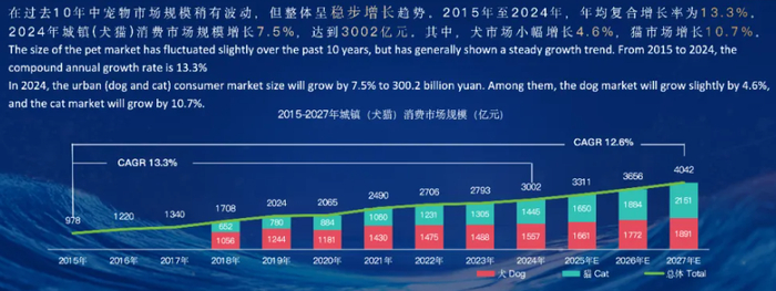 根据《2025年中国宠物行业白皮书》,2015年至2024年,国内宠物市场整体呈稳步增长趋势,年均复合增长率为13.3%。