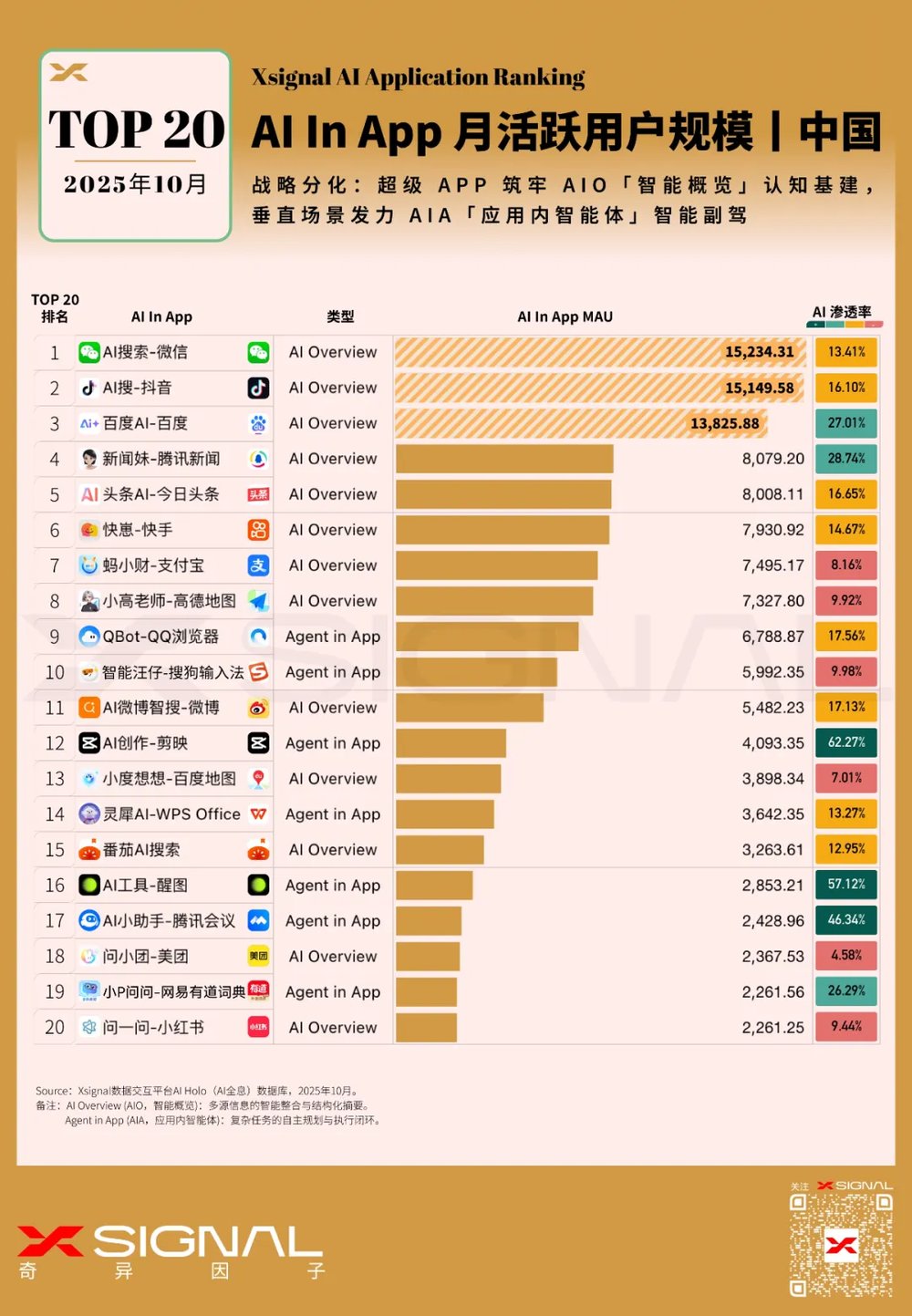 Xsignal AI Holo(AI 全息)数据库显示,中国移动互联网的AI落地已彻底分化为两条路径:以微信、抖音的AI搜索为代表的“AI Overview (AIO)”旨在筑起认知的长城,将决策锁定在生态内部;而以QQ浏览器QBot为代表的“Agent in App (AIA)”则正演变为主动式的“数字员工”,重构服务分发的主权。