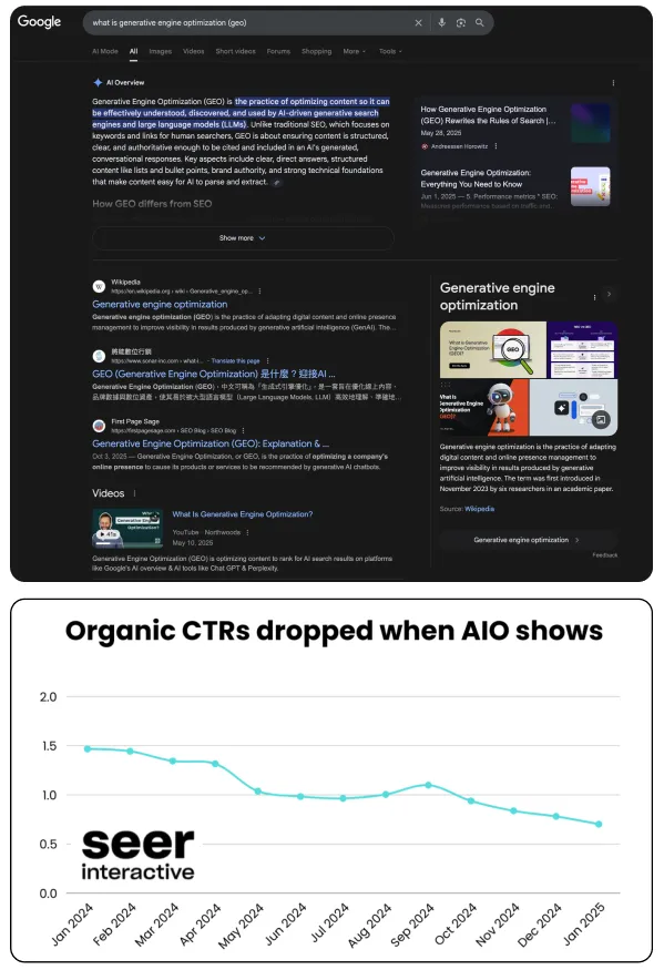 在AI生成结果直接呈现答案的情况下,用户越来越少点击传统搜索结果或广告,而是倾向于从AI生成内容中直接获取信息。这种变化对企业的自然流量(Organic CTR)和付费流量(Paid CTR)造成了深远影响。