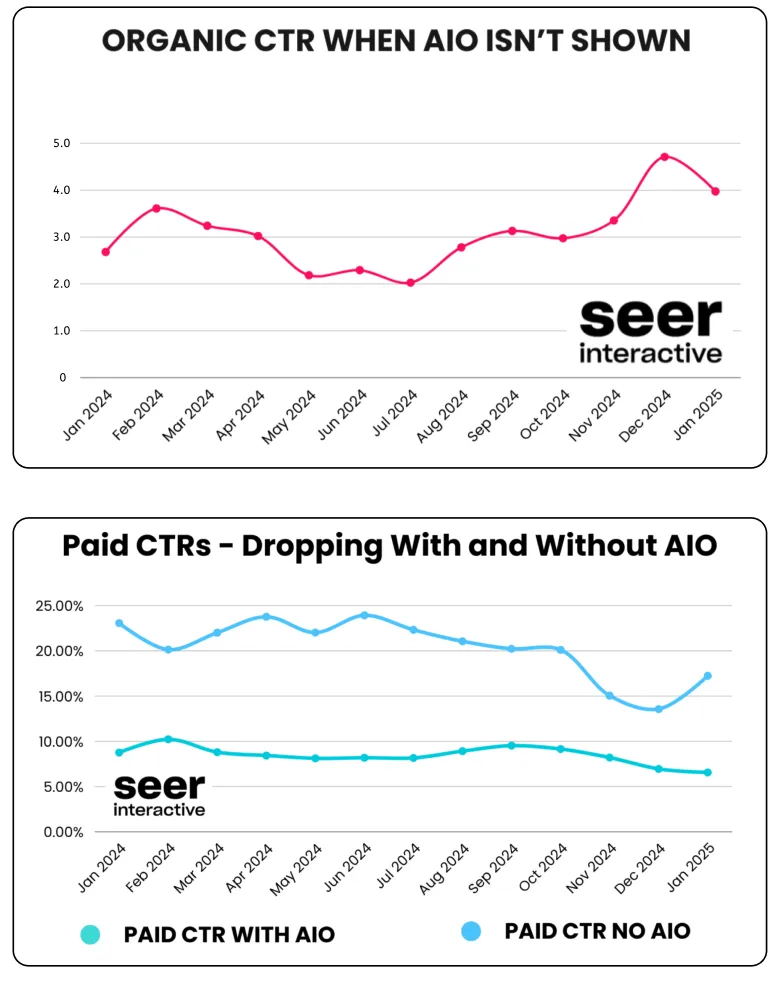 在付费广告领域,CTR 同样出现显著下降。无论是否出现 AIO,付费点击率均呈现持续下滑趋势:从 2023 年初约 20–25%降至 2025 年初不足 10%。