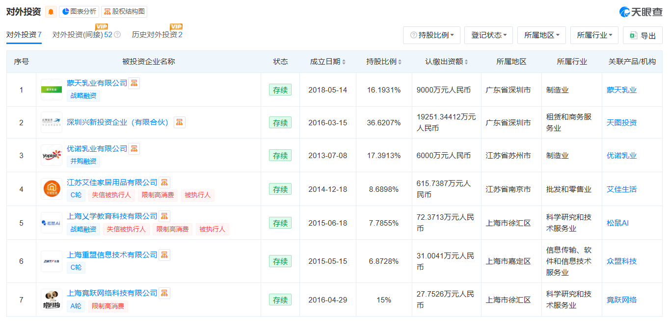 公开信息显示,天图兴鹏持有优诺乳业约17.39%的股份。该基金成立于2017年,注册出资额高达26.60亿元,LP包括 深圳市引导基金 、 福田引导基金 、 前海母基金 、深圳 鲲鹏资本 、无锡城市发展等国资机构,以及 招商资管 、 兴业基金 、 长城人寿 、 南方资本 、 博时资本 等市场化机构。