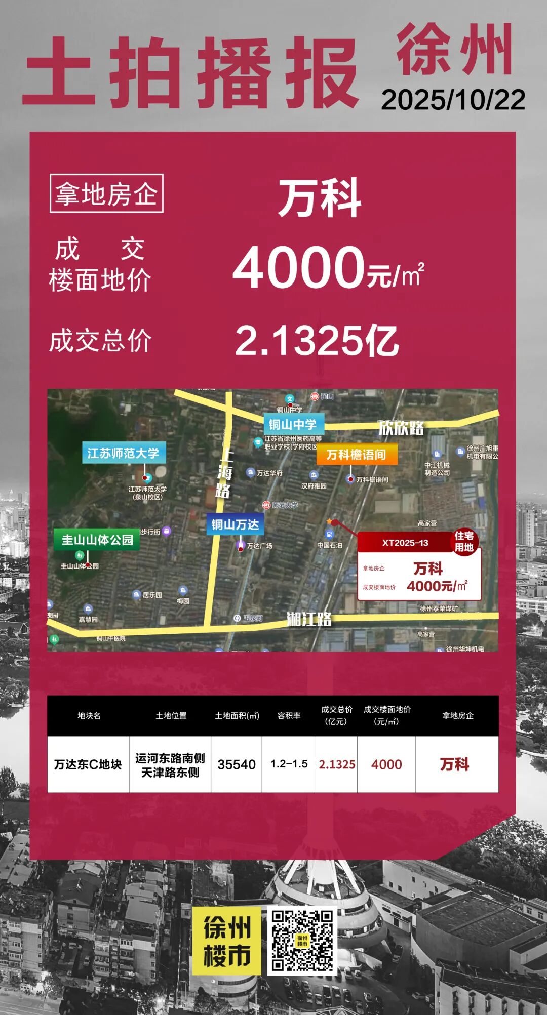 今年10月底, 万科 举资2.1325亿元拿下万达东C地块,成交楼面地价4000元/㎡。