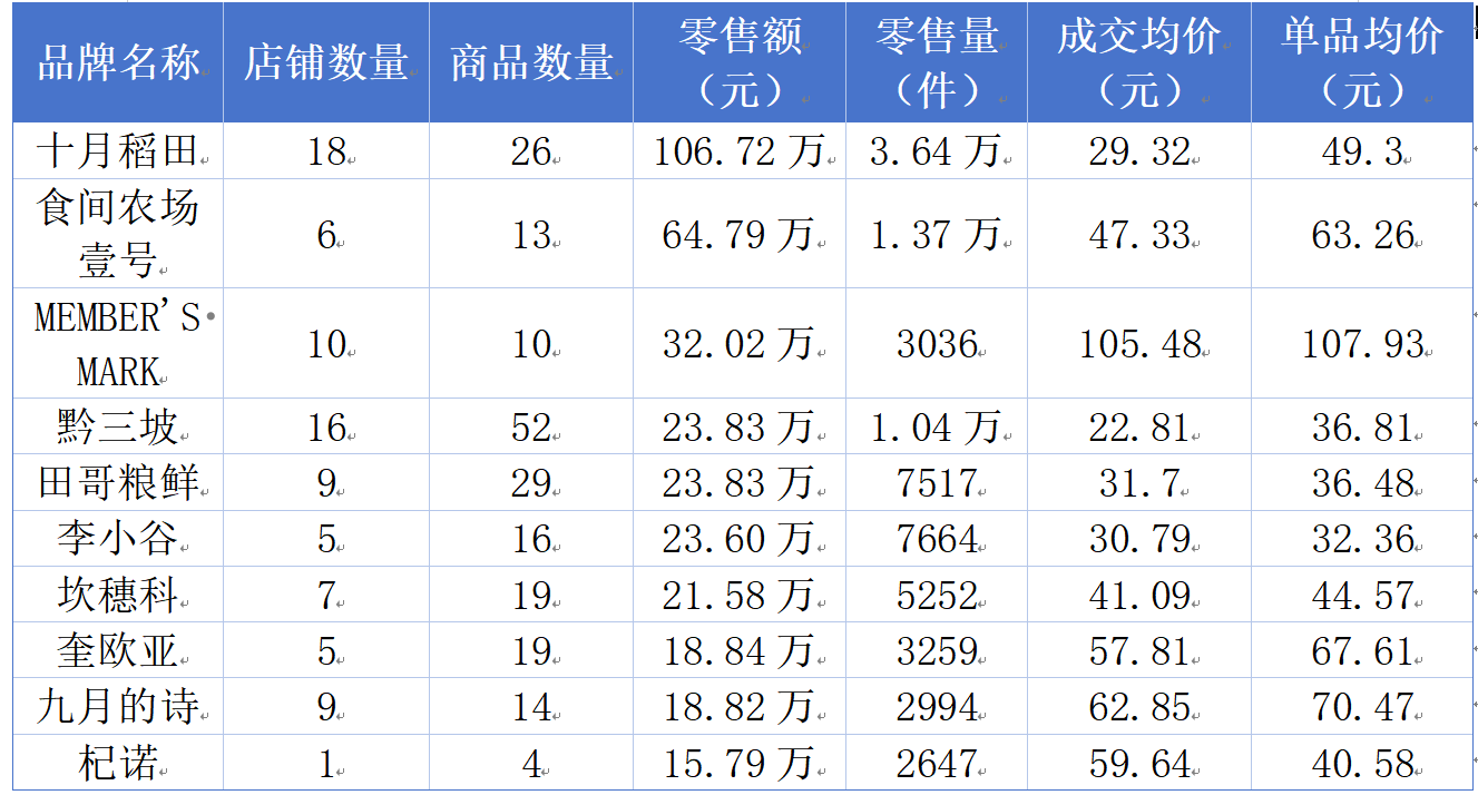 在品牌格局方面,“十月稻田”以106.72万元零售额、3.64万件零售量位居榜首,其背后企业“五常市彩桥米业有限公司”凭借“十月稻田”和“食尚农场壹号”两个品牌,总零售额达112.70万元,成为藜麦市场的最大赢家。