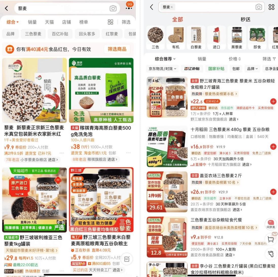 图为淘宝和京东平台藜麦页面
