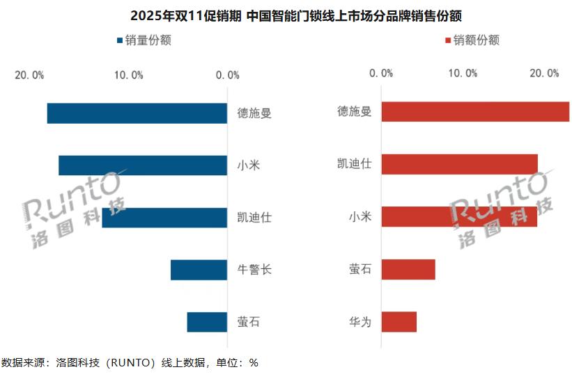 根据洛图科技(RUNTO)最新发布的数据,2025年双11大促期间,中国智能门锁线上市场销量为137.5万套,同比大幅下降25.8%。在整体市场遇冷的背景下,各品牌表现分化明显。