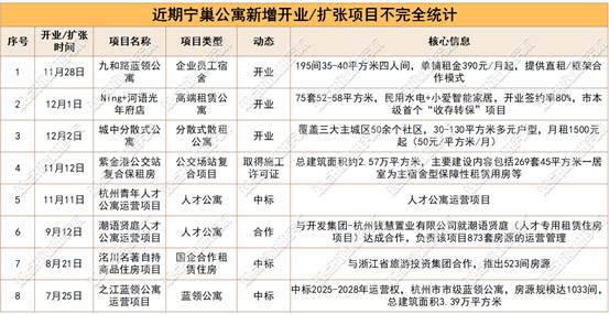 11月底,九和路蓝领公寓开业,提供单铺390元/月起的企业定制宿舍。12月1日,Ning+河语光年府店作为杭州市本级首个收存转保项目开业,当日签约率突破80%。12月2日,宁巢公寓城中店全面启幕,项目以分散式模式覆盖三大主城区50余个成熟社区。