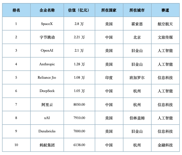 中国AI独角兽表现尤为亮眼,从2家增至9家,涨幅达350%,凸显政策与资本的双重赋能。DeepSeek等企业通过生成式AI与模块化技术深耕垂直场景,推动技术商业化落地。与此同时,字节跳动凭借算法优化内容推荐、蚂蚁集团依托智能风控跻身全球前十,阿里云则通过AI赋能云计算服务,共同构筑中国独角兽的头部阵营。