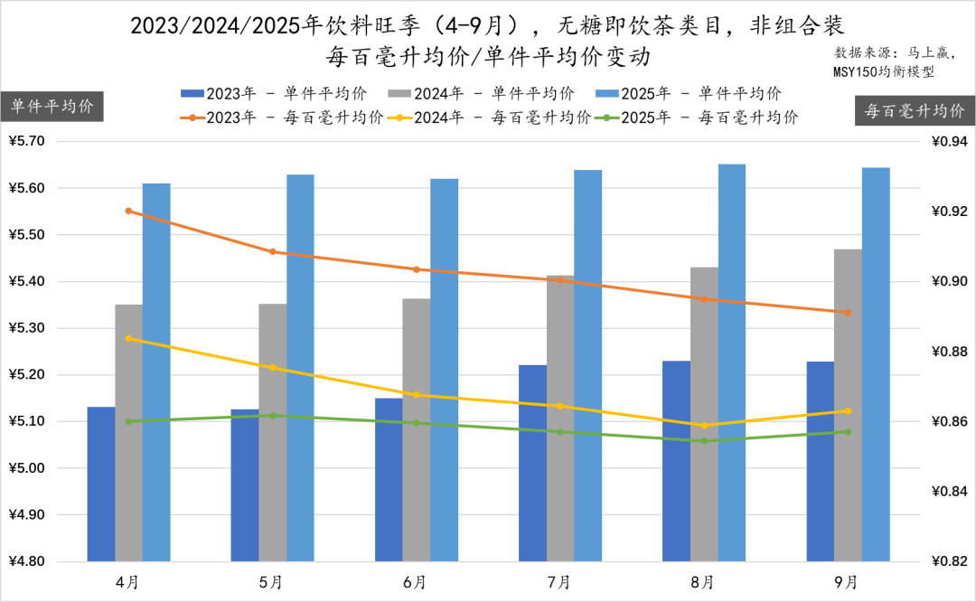 以近年爆火的无糖茶与“养生水”(中式养生饮料)品类为例。马上赢数据显示,在2025年饮料旺季(4-9月),无糖茶饮料的单件(瓶)平均价与每百毫升均价,已从2023年的约5.6元、0.9元,分别下滑至约5.15元、0.86元。