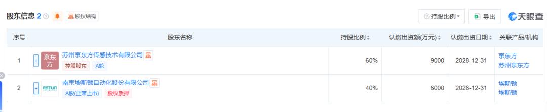 股权穿透显示,这家新公司由京东方旗下苏州京东方传感技术有限公司(以下简称"京东方传感")与国产机器人龙头埃斯顿共同持股。