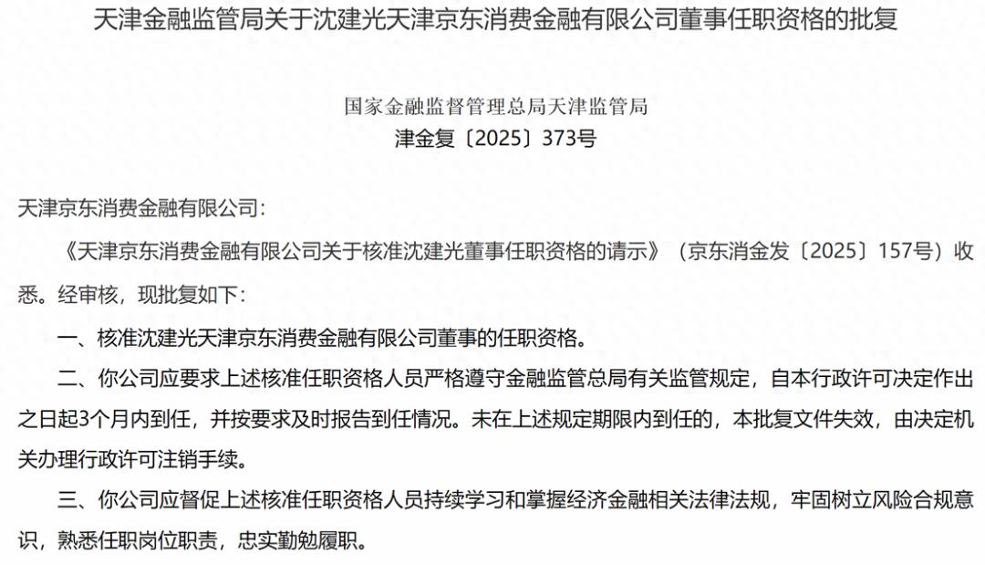 12月5日, 国家金融监督管理总局 天津金融监管局官网显示,核准沈建光天津 京东 消费金融董事的任职资格。