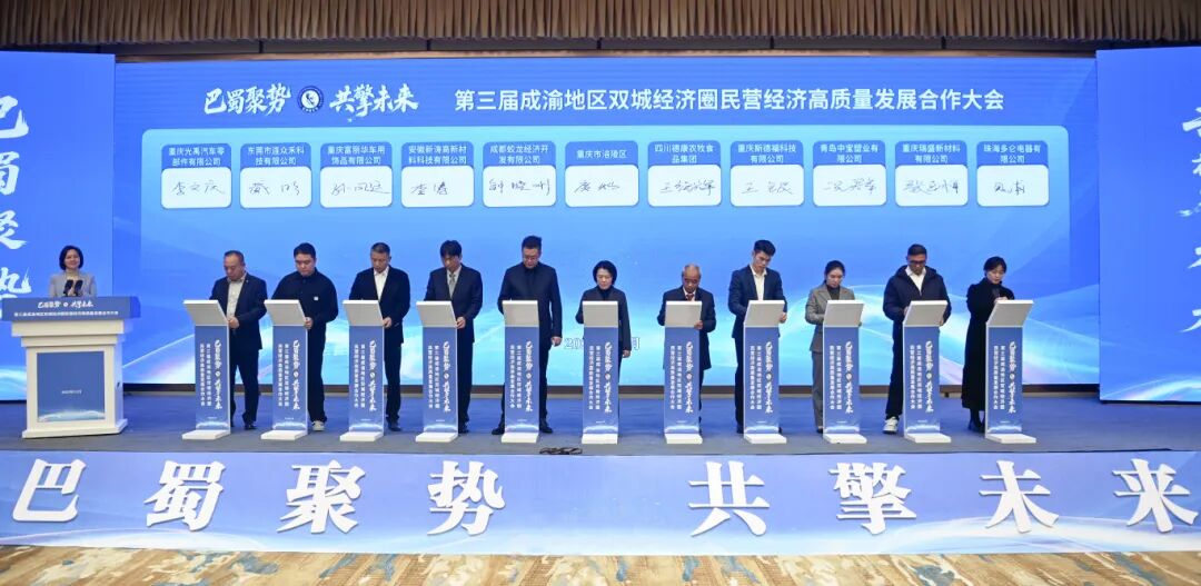12月5日,第三届成渝地区双城经济圈民营经济高质量发展合作大会在重庆市涪陵区成功举行。本次大会以“巴蜀聚势·共擎未来”为主题,通过搭建高端交流平台,集聚各方优质资源,共商合作大计,共绘发展蓝图,不仅为区域协同发展注入了新活力,也进一步明晰了民营经济跃升路径,为川渝两地携手谱写新时代西部“双城记”贡献了坚实的民营力量。