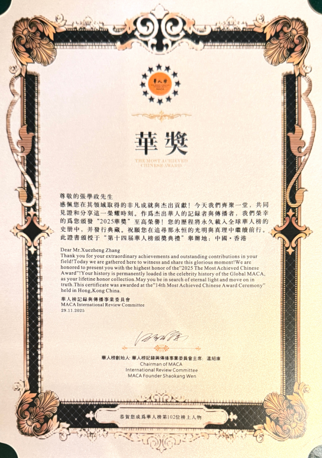 华人之光 引领产业!张学政先生荣膺2025华人榜MACA企业家成就奖