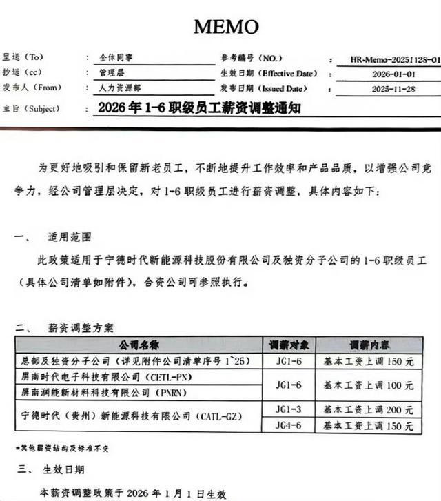 日前 宁德时代 发布薪资调整通知,称为了更好吸引和保留新老员工, 宁德时代 总部和几家分公司的1—6级员工将集体涨薪,月涨薪数额从100到200元不等,平均涨薪150元。150元虽然不算多,一年下来也就1800元,但是在整个汽车行业内卷的关键时刻, 宁德时代 涨薪了,除了展现 宁德时代 对员工的关怀外,也能看得出来,这是真挣钱了。