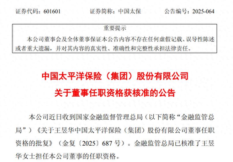 公告显示,中国太平洋保险(集团)股份有限公司近日收到 国家金融监督管理总局 《关于王昱华中国太平洋保险(集团)股份有限公司董事任职资格的批复》(金复〔2025〕687号),金融监管总局已核准王昱华担任公司董事的任职资格。
