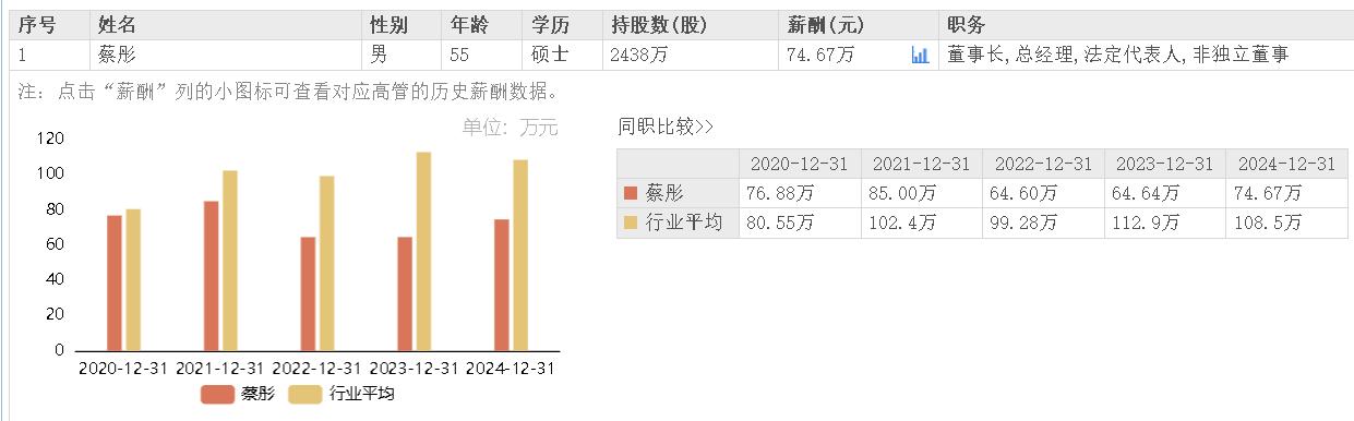 据东方财富网数据,蔡彤2024年所获薪酬为74.67万元,相较上年薪酬64.64万元涨薪10.03万元。
