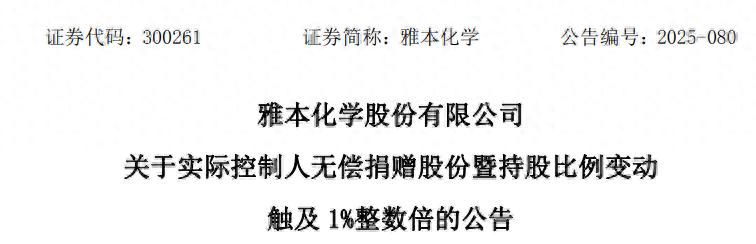 雅本化学表示,本次捐赠不会导致公司控制权变更,也不影响公司经营及治理结构。