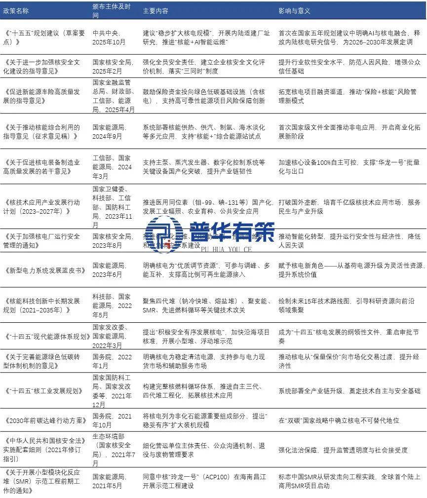 “十四五”以来,国家明确“积极安全有序发展核电”,强化自主可控与多能融合。政策聚焦审批提速、技术升级、区域供热、燃料保障及国际合作,支持小型堆、四代堆示范,并纳入新型能源体系与“双碳”战略。《“十五五”规划建议》提出,要加快建设新型能源体系,加快沿海核电等清洁能源基地建设,推动能源结构优化升级;同时提出力争建成100个左右国家级零碳园区,促进产业绿色低碳转型。这一系列部署为民用核能等清洁能源发展拓展了应用空间与市场前景。