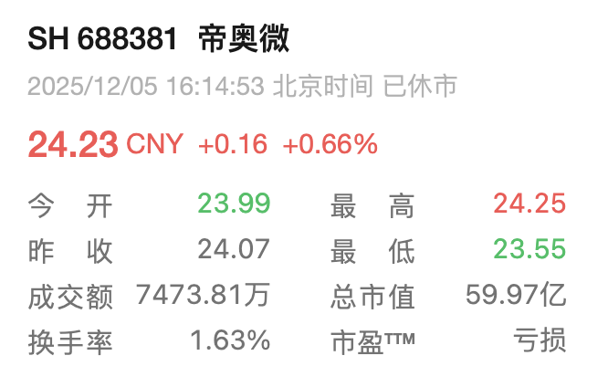 二级市场上,截至12月5日收盘, 帝奥微 上涨0.66%报24.23元/股,总市值约59.97亿元。