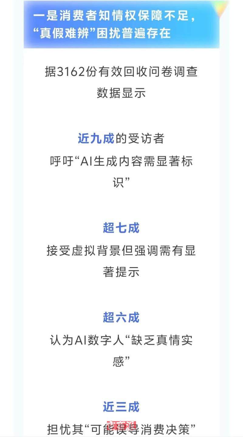 北京消协专项调查显示,近九成受访者呼吁对AI 生成内容进行显著标识,超六成消费者吐槽 AI 数字人“缺乏真情实感”,近三成受访者担忧其“误导消费决策”。